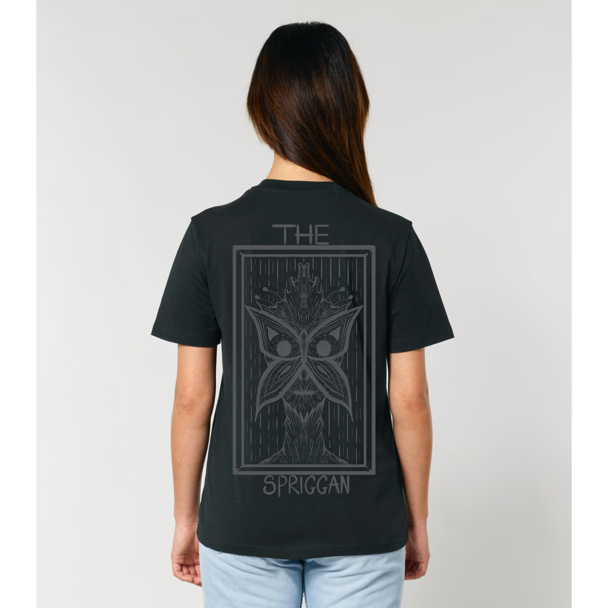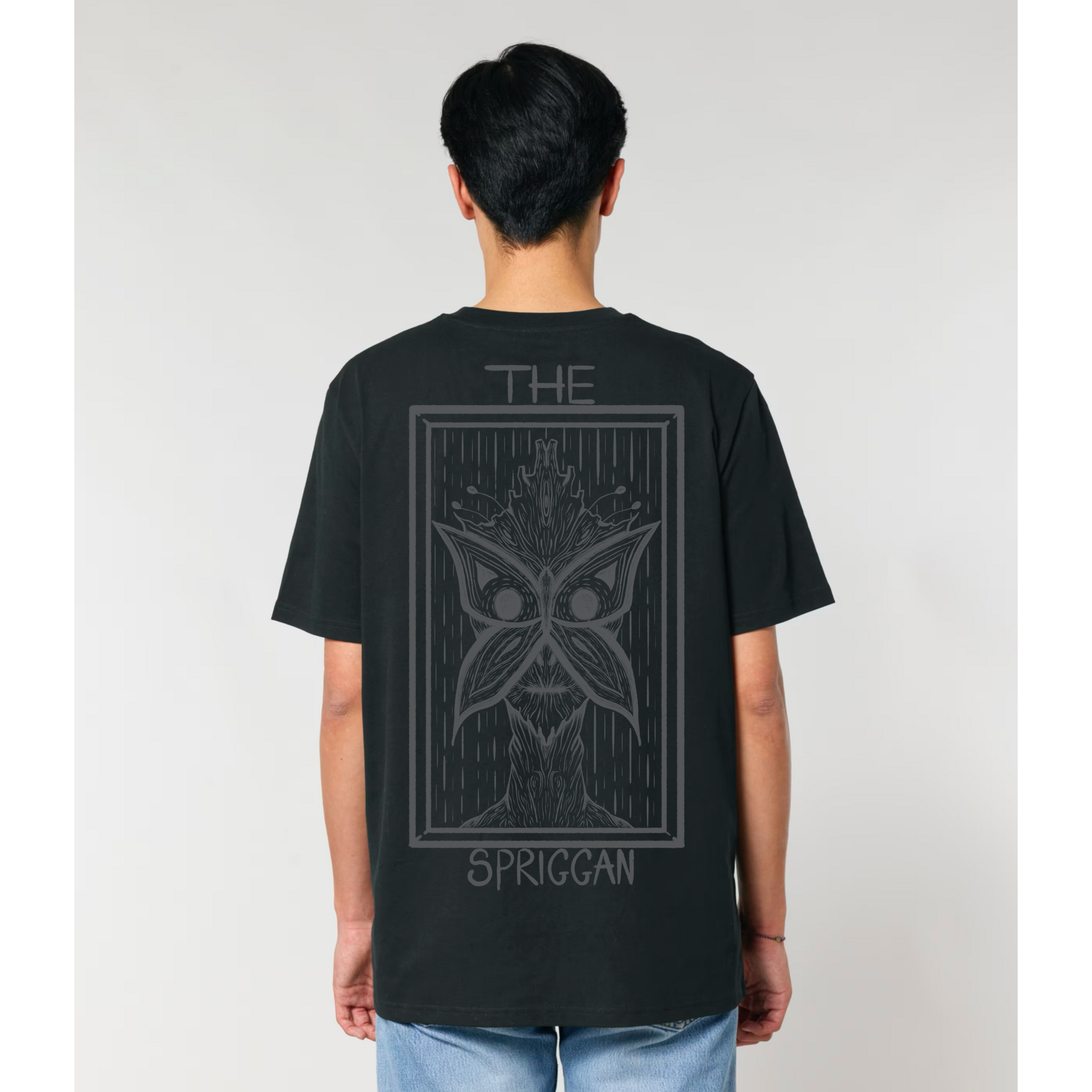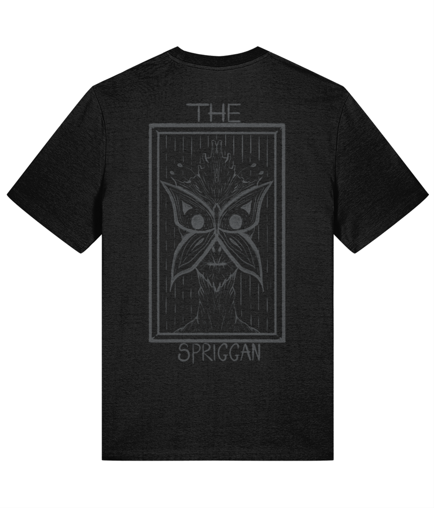 The Spriggan - Medium Fit Tee features a unique graphic inspired by Cornish folklore. The back boasts bold print while the left chest showcases a mini print. Made of 100% organic ringspun combed cotton, this shirt has a medium fit and is crafted with a single jersey and set-in sleeves. The neck collar, sleeve hem, and bottom hem all have 1x1 rib detailing, with self fabric inside the back neck tape. To ensure durability, the sleeve and bottom hems are reinforced with wide double needle topstitch. With a weight of 180 gsm, this tee is both stylish and comfortable.