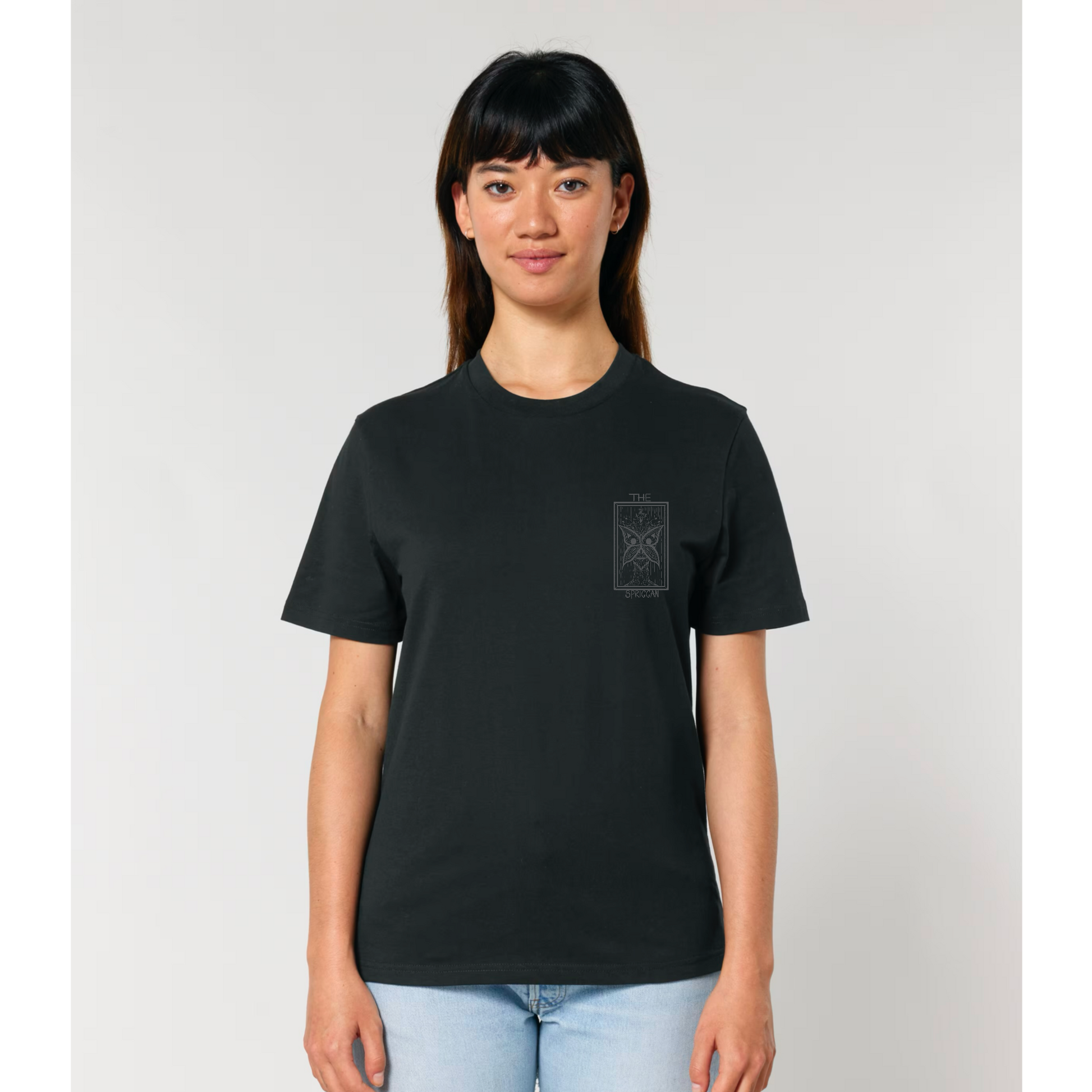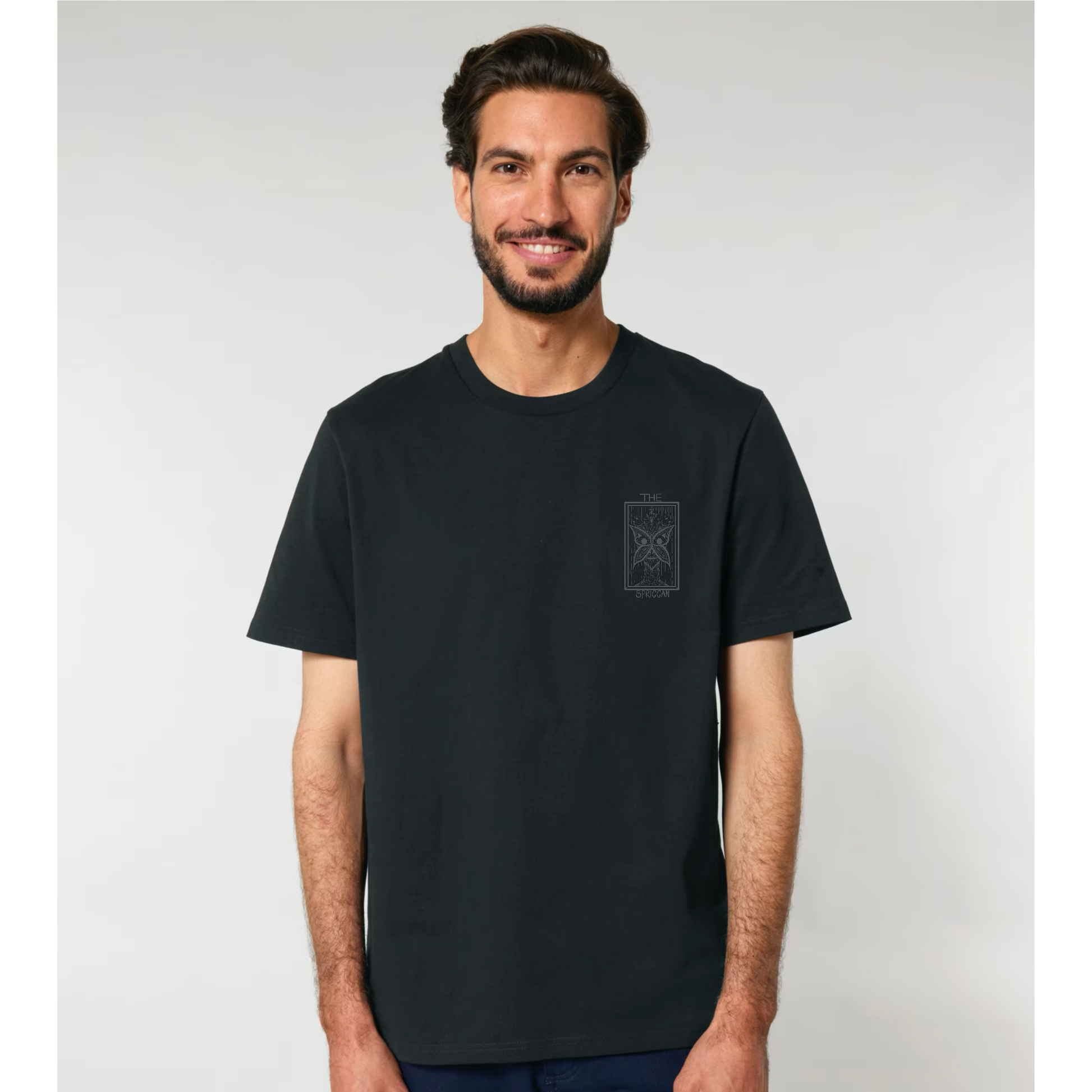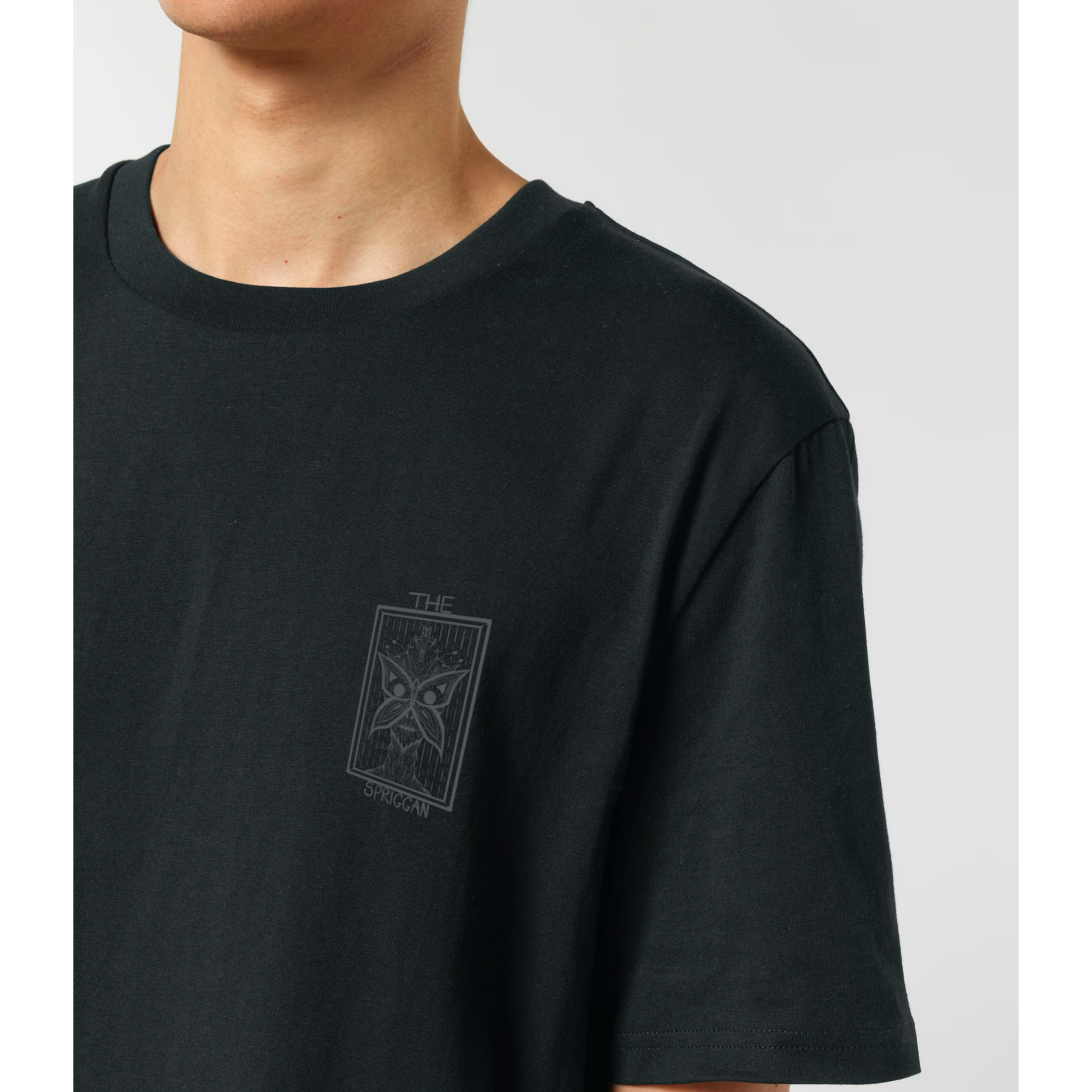 The Spriggan - Medium Fit Tee features a unique graphic inspired by Cornish folklore. The back boasts bold print while the left chest showcases a mini print. Made of 100% organic ringspun combed cotton, this shirt has a medium fit and is crafted with a single jersey and set-in sleeves. The neck collar, sleeve hem, and bottom hem all have 1x1 rib detailing, with self fabric inside the back neck tape. To ensure durability, the sleeve and bottom hems are reinforced with wide double needle topstitch. With a weight of 180 gsm, this tee is both stylish and comfortable.